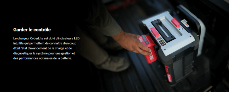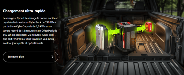 Conçu pour les professionnels, le système de charge DC-DC CyberTank Lite redéfinit la portabilité. Il est conçu pour transférer l'énergie d'une CyberCapsule à n'importe quel CyberPack en seulement 12 minutes. Cette mobilité garantit que vos outils peuvent être rechargés rapidement et efficacement, ce qui vous permet de rester opérationnel sans les contraintes d'un lieu de chargement fixe.